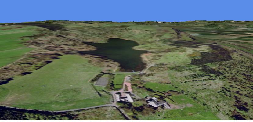 The main difference is that the second image has been enhanced by Ultimate Terrain Europe, which has added (a) a correctly placed lake, (b) a correctly placed road in the foreground, and (c) a sort-of correctly placed track on the left. Neither image adequately shows the local vegetation; the trees are smaller but more numerous. My house lies between the foreground road and the lake, but neither image shows it.